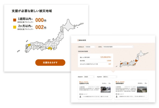 サイトTopページに、被災地域の場所を示した日本地図の表示が追加され、直近1週間と2ヶ月の間でどの地域で災害が発生したか確認することができます。新コンテンツ「被災地の状況」ページでは、災害発災年や災害名で絞り込み、集まった寄付金額やその後の復興状況を確認できるようになりました。