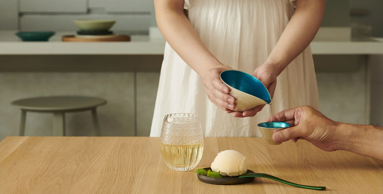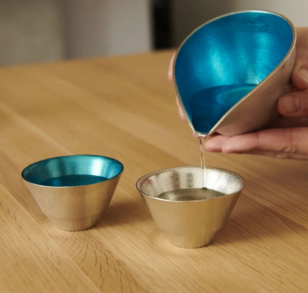 ■400年以上の歴史を持つ鋳物の町・富山県高岡市で創業し今や世界中で愛される鋳物メーカー「能作」。 「より能(よ)い鋳物を、 より能(よ)く作る」をモットーとし、 素材の特性を生かしたテーブルウェアやインテリア用品を製造している。 錫(すず)100%で作られた酒器は、 デザインの美しさと実用性の高さで同社を代表するアイテム。 錫は非常にやわらかい素材のため、 錫100%で製品化するには、 通常なら機械で行う工程も職人の手仕事で行う必要があり、 この酒器の最大の特徴である美しいブルーは、 伝統工芸でも使われる技法により職人がひとつずつ着色した。