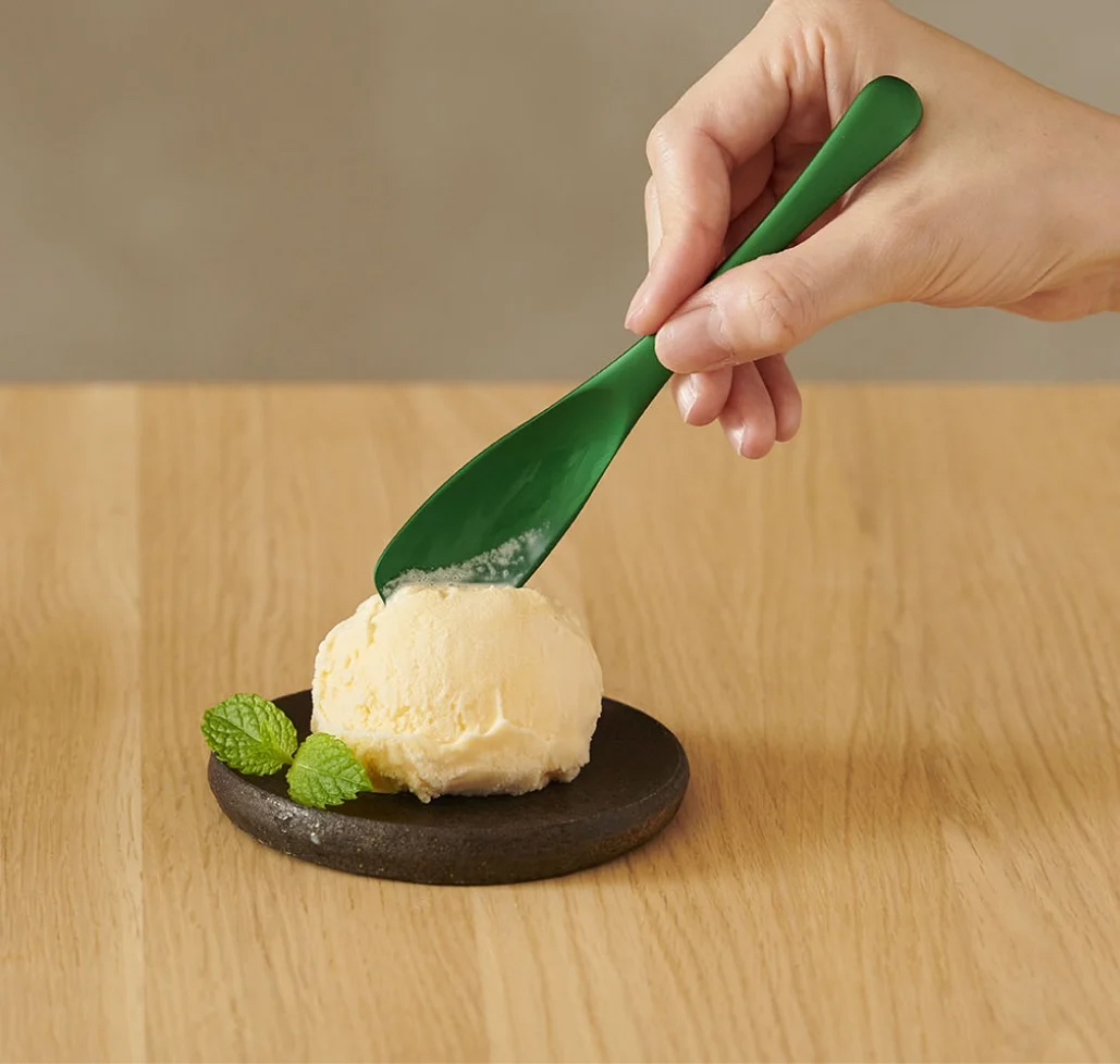■日本を代表する金属加工の街・新潟県燕市で洋食器を手がける株式会社トーダイ。 スプーンの材質はステンレスが一般的な中、 約8年前に、 熱伝導に優れたアルミを通して手の熱が伝わり、 カチコチのアイスクリームでもすくいとれる「アイス専用スプーン」を開発した。 スプーンの先端部分は「刺さりやすい」「食べやすい」「カップの底まできれいにすくえる」3つの用途に合う角度に調整されている。 スプーンを彩る優しいカラーは、 アルミの表面に施した「アルマイト加工」によるもので、 これにより陶器のような質感を与え、 なめらかな口当たりも実現した。 1日の終わりにゆっくりアイスを楽しむご褒美時間を、 もっと楽しくしてくれる逸品。