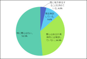 - ◇「地方移住」への関心について、「関心はあるが具体的には検討していない」(34.9%)、「現在検討している」(9.6%)、「既に地方移住することを決めている」(4.0%)の「関心がある」人の合計が48.5%で、「特に関心はない」が51.5%と、関心の有無でほぼ半数に分かれた。