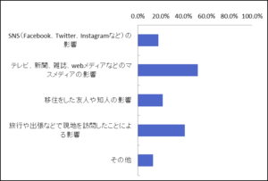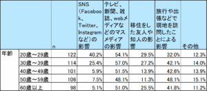 - ◇地方移住に関心を持ったきっかけは、「テレビ、新聞、雑誌、webメディアなどのマスメディアの影響」が52.5%と最も多く、次いで「旅行や出張などで現地を訪問したことによる影響」が41.0%となった。年代別では、20代の約4割(40.2%)が「SNS(Facebook、Twitter、Instagramなど)の影響」で地方移住に関心を持ち、若年層のSNSへの高い影響力がわかった。