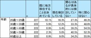 - ◇20代の10人に1人が、「既に地方移住することを決めている」と回答。他の年代(30代:5.9%、40代:0.9%、50代:2.3%、60代以上:0.9%)と比べて、20代は地方移住を決めている傾向が強いことがわかった。