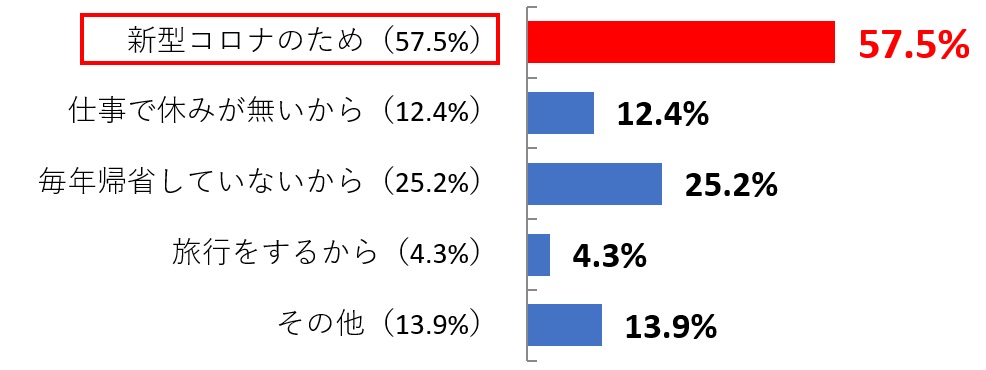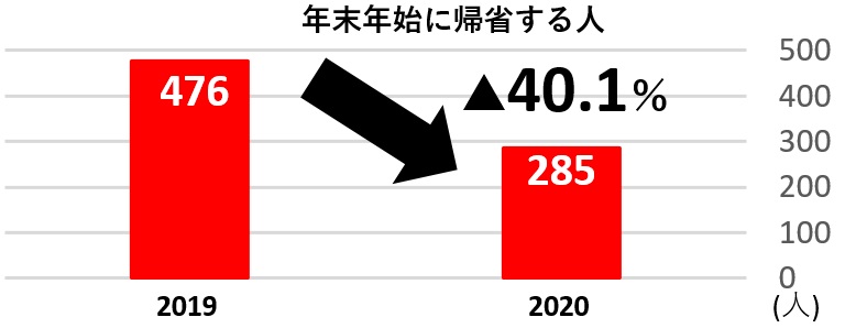 昨年の年末年始に「帰省をした」と答えた人が476名に対して、今年すでに「帰省する」と決めている人は285名にとどまり、前年比40.1%減となったことが分かりました。一方「帰省しない」「まだ決めていない」と回答した人の理由として、「新型コロナウイルス感染拡大防止のため」と回答した人が最も多い約6割を占め、お盆にとどまらず年末年始も帰省の自粛を検討する人が多くいることが伺えます。また自由回答には「大学の集中講義がある」「子供が受験のため」などの回答がありました。