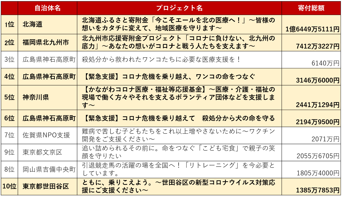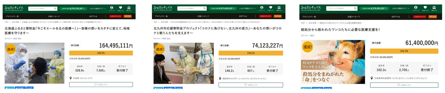 1)2020年に最も寄付を集めたPJは、北海道の医療支援PJで計1億6449万5111円。北海道は4月~7月、コロナの感染拡大を受け、地域医療を守るために医療従事者らへの支援や医療用資機材の整備を目的としたGCFを実施。お礼の品はありませんが、開始わずか2日で目標の5000万円を達成しました。その9割が北海道在住者からの寄付で、ふるさと納税で居住地域を応援する新たな動きが生まれました。