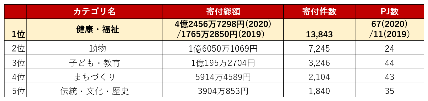 1)医療支援などコロナ関連PJの増加と寄付の反響で、「健康・福祉」カテゴリーのPJが寄付総額、寄付件数、PJ数のいづれも他カテゴリーと大差をつけて1位となりました。2019年1月~12月2日時点の「健康・福祉」は8位で、寄付総額約1765万円、PJ数は11件。2020年はPJ数が前年比6倍超に増えました。
