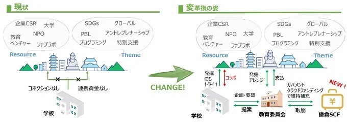鎌倉市立の小中学校において、リアルな社会課題に基づくプロジェクト型学習や、多様な特性を持った子どもへの個に応じた支援・指導など、学校現場が主体となり、大学や教育ベンチャー等の外部機関と連携しながら更に魅力的な教育を実現します。