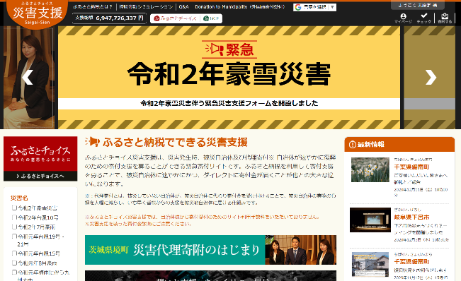2014年9月、ふるさと納税サイトで初めて開始。ふるさと納税を活用して被災自治体の復旧復興の寄付金を募る仕組み。契約の有無にかかわらず全国の自治体にプラットフォームを無償提供する。自治体はサイトで被災状況や寄付金の活用事例を報告できる。寄付者は、寄付金と一緒に被災地への応援メッセージを送ることができる。これまで30超の災害で募った寄付総額は累計69億円超。令和2年7月豪雨、台風10号では計7億円超を集めた(2020年12月時点)。