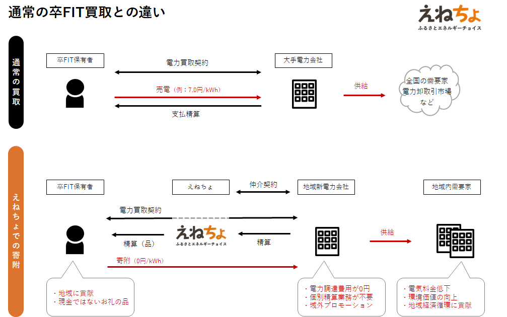 特定の地域の自治体新電力(自治体が出資する電力会社)へ卒FIT電力を無償で寄付する。地域によっては、寄付電力量に応じて地域のポイントがもらえ、地域の特産物と交換ができる。