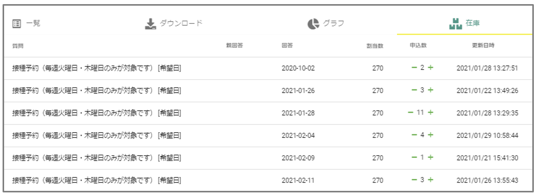 ・ 在庫管理 :ワクチン在庫数と予約枠数をリアルタイム表示