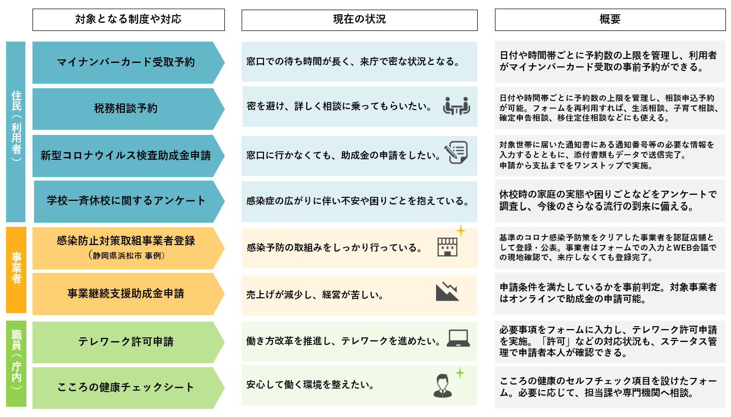 2020年3月にリリースしたLGWAN-ASPサービスの行政総合プラットフォーム。 LGWANとインターネットの両方に対応。 各種手続きや助成金の申請、 アンケートや申し込み、 問い合わせ窓口といった住民サービスのほか、 庁内の届け出、 上長への報告フォーム、 データ入力と集計、 調査票など庁内業務もデジタル化もできる。 マイナンバーカードを活用したデジタルIDアプリと連携しており、 本人確認が必要な申請もハンコや身分証なしでオンライン完結が可能。 現在、 無料トライアルを実施中。