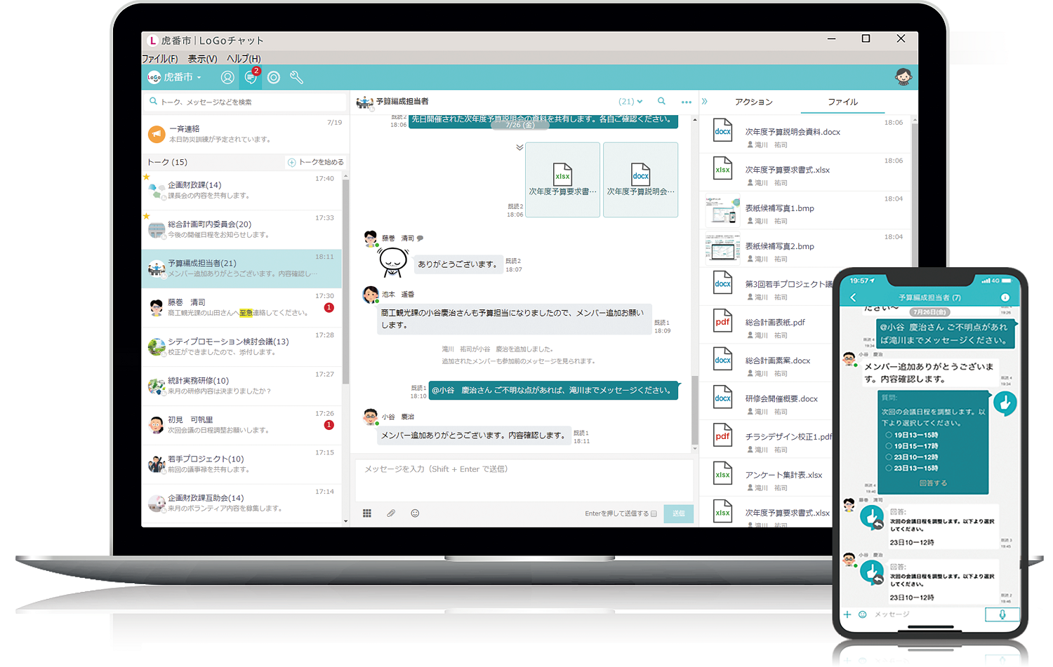 「LoGoチャット」は国内初のLGWAN-ASPサービスの行政専用ビジネスチャットです。 LGWANとインターネット両方に対応し、 職員はPCやスマホで庁内や他自治体、 外部事業者とやりとりできます。 部署横断PTや接種会場スタッフとチャットでつながることで、 電話やメールよりも密な情報連携体制を作れます。