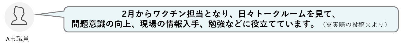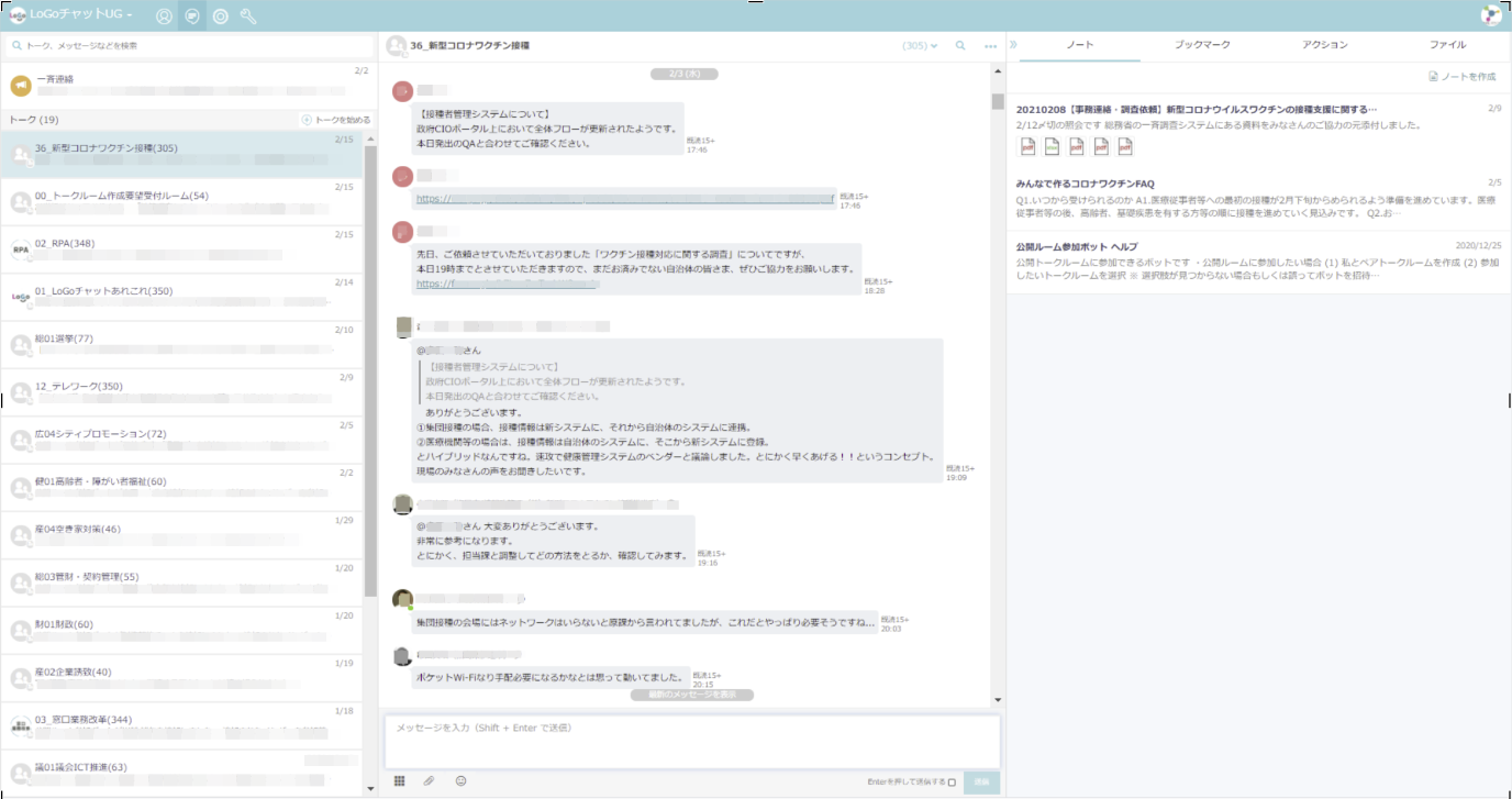 「LoGoチャット」を使う全国の自治体職員がつながるユーザーグループには、 約100テーマのトークルームを開設しています。 「新型コロナワクチン接種」のルームでは、 各自治体からワクチン対応に関する疑問点やそれに対する回答、 国の動きなど最新情報の共有、 業務ノウハウについてのやりとりが飛び交い、 自治体同士がチャット上でワクチン業務を助け合う動きが生まれています。