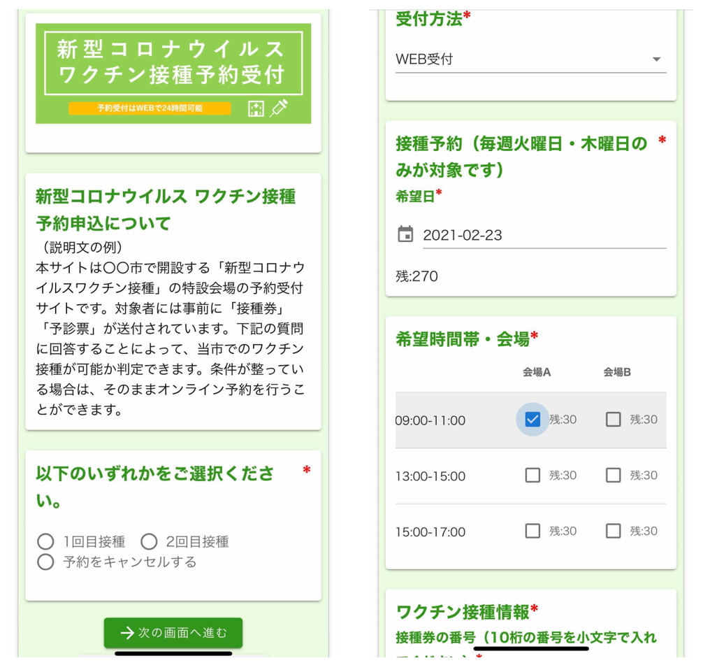 「LoGoフォーム」のスマホ画面イメージ(右:TOPで接種回数などを選択 / 左:接種希望日や会場、時間帯から予約枠残数を見て選択)