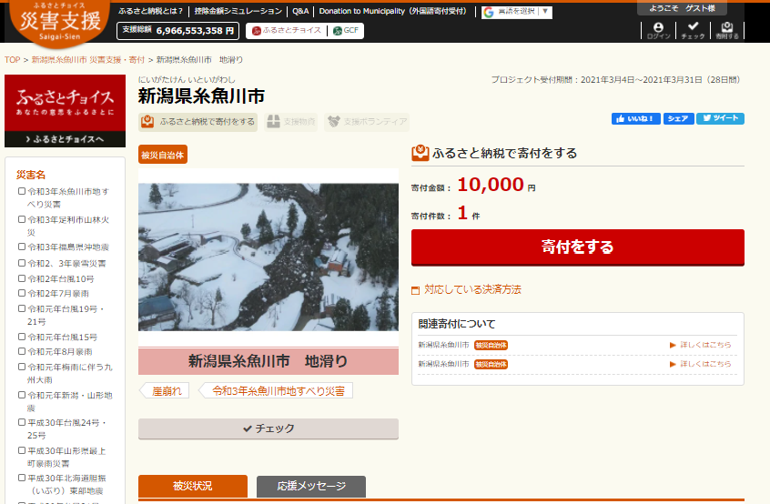 「ふるさとチョイス災害支援」の新潟県糸魚川市の寄付申し込みページ