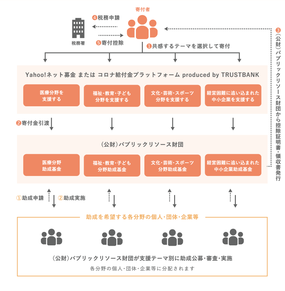 本プロジェクトでは、ヤフーとトラストバンクがそれぞれ立ち上げた本プロジェクト専用の寄付サイトを通じて、寄付を募ります。パブリックリソースが各分野の基金を立ち上げ、資金支援を必要とする個人、任意団体、非営利法人、医療機関、中小企業(個人事業主を含む)を公募します。各テーマに精通した専門家・有識者が審査委員となり、寄付先となる個人や団体・企業などを公平・中立かつ適正に選考し、助成金を届けます。