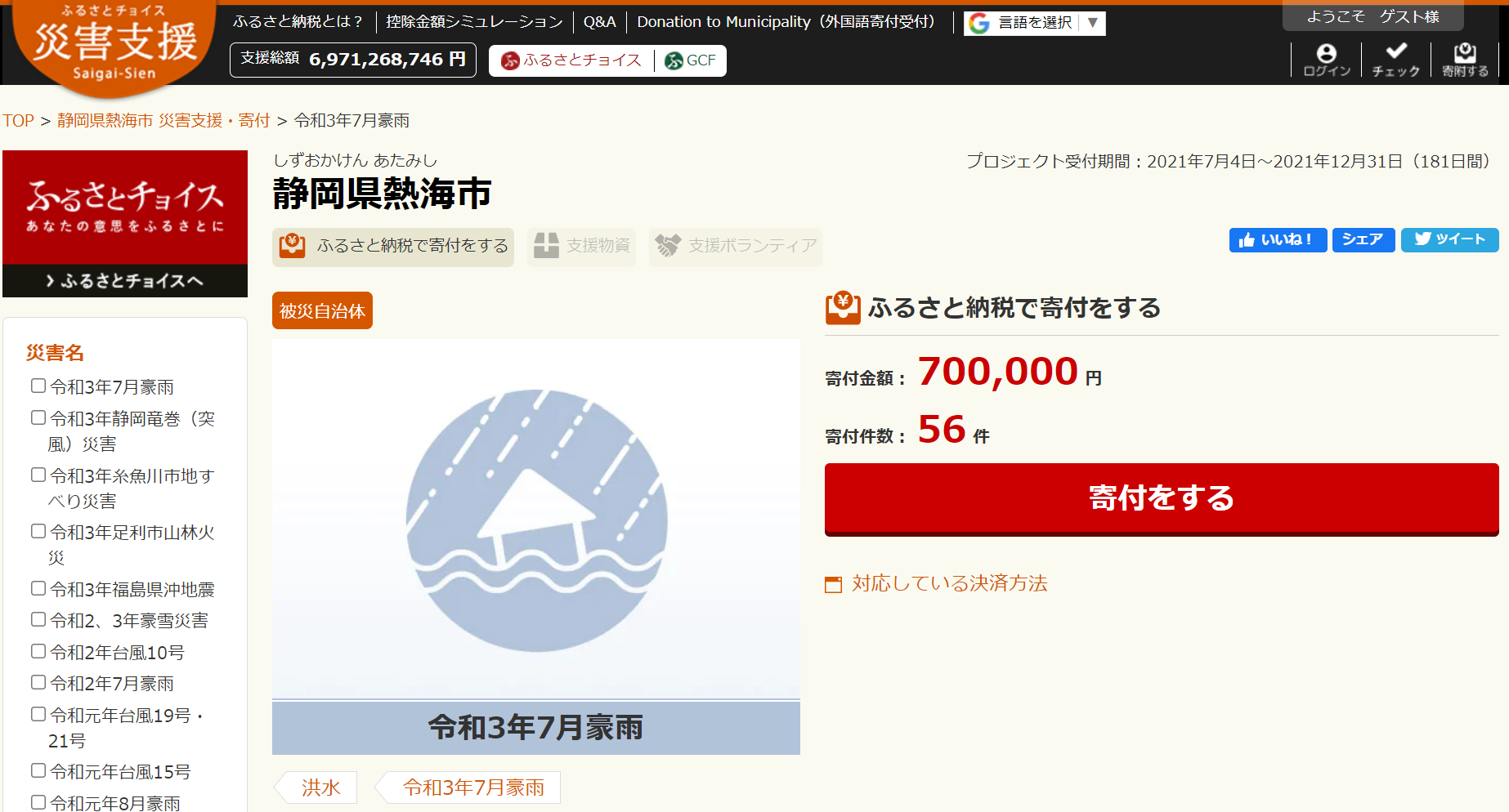 ふるさと納税総合サイト「ふるさとチョイス」を企画・運営する株式会社トラストバンク(本社:東京都渋谷区、代表取締役:川村憲一、以下「トラストバンク」)は7月3日に、ふるさと納税で被災自治体の災害支援に寄付できる仕組み「ふるさとチョイス災害支援」(https://www.furusato-tax.jp/saigai/)で、令和3年7月豪雨による被災自治体支援のための「災害時緊急寄付申込みフォーム」を開設しました。7月4日17時20分現在、神奈川県湯河原町と静岡県熱海市が寄付を受け付け、累計150万円超(120件以上)の寄付を募っています。寄付金は、被災地の復旧・復興に使われます。
