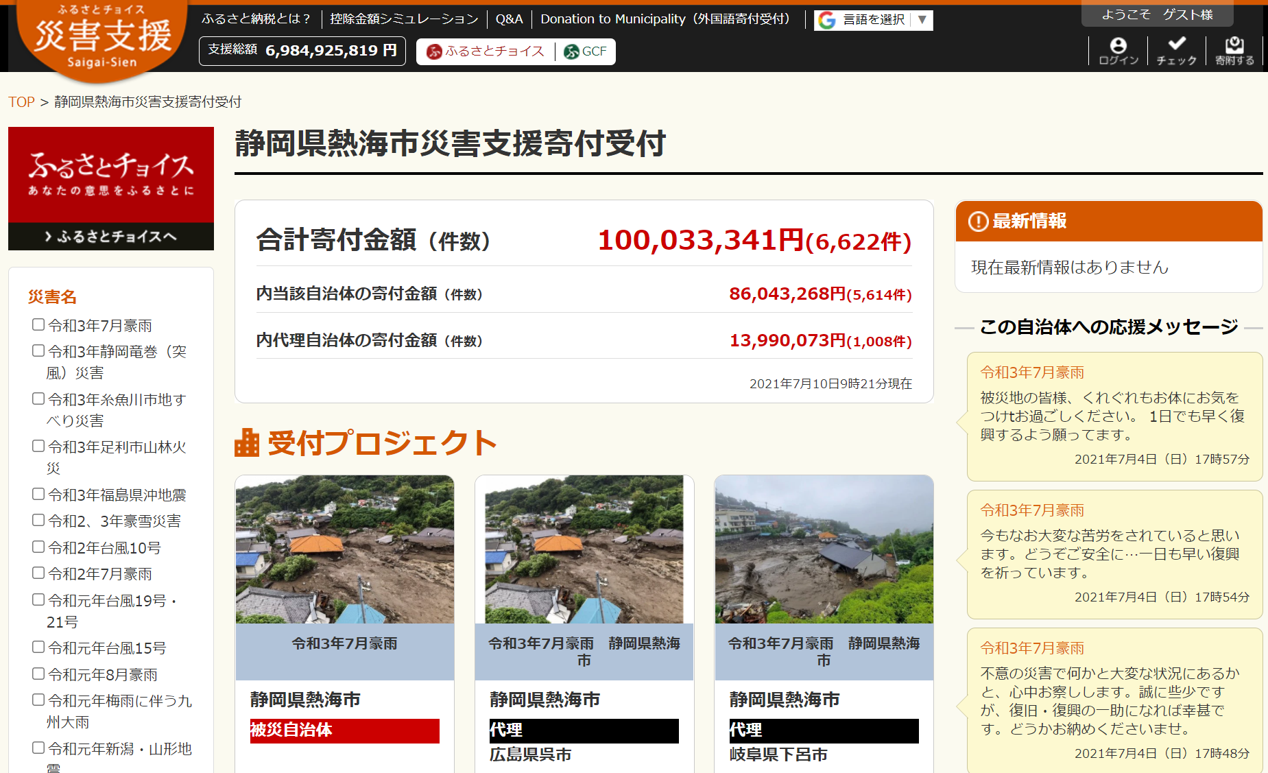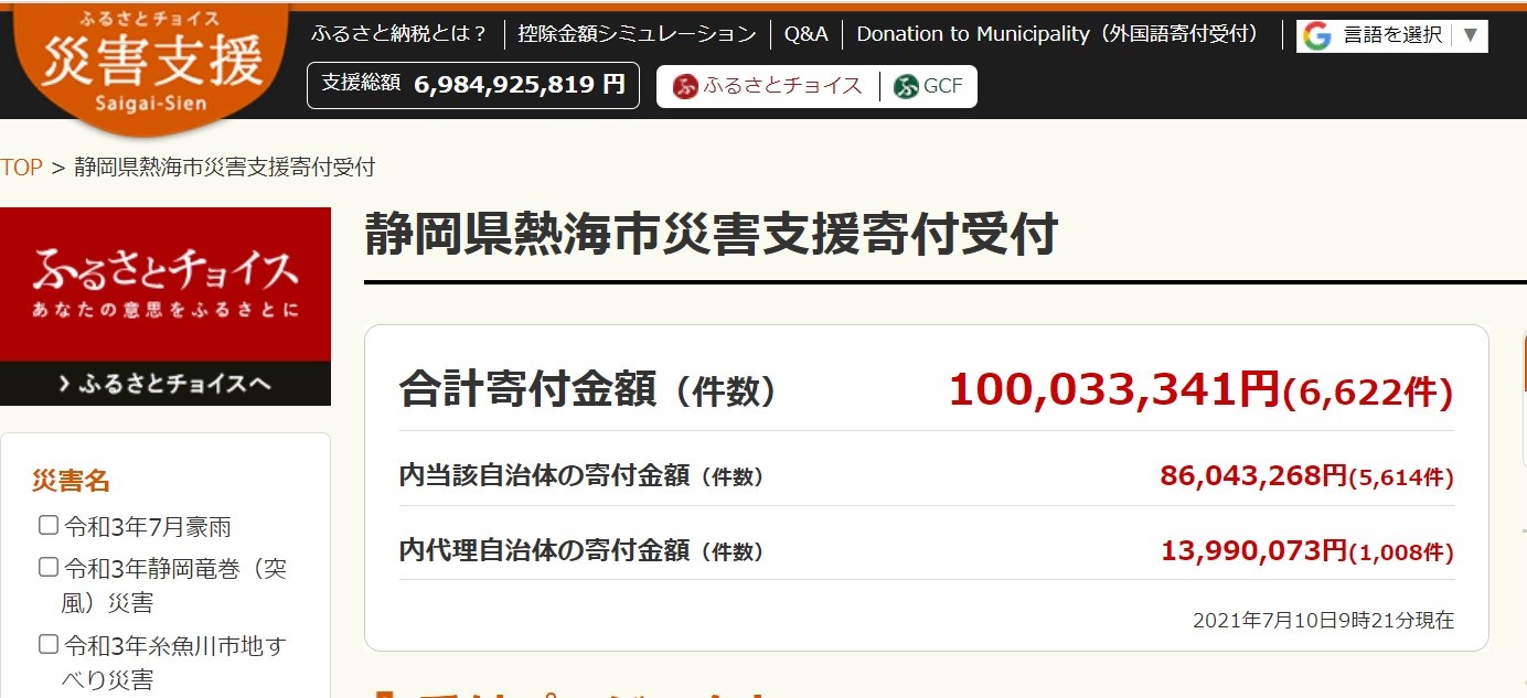 ふるさと納税総合サイト「ふるさとチョイス」を企画・運営する株式会社トラストバンク(本社:東京都渋谷区、 代表取締役:川村憲一、 以下「トラストバンク」)は7月10日に、 ふるさと納税で被災自治体の災害支援に寄付できる仕組み「ふるさとチョイス災害支援」( https://www.furusato-tax.jp/saigai/ )で、 令和3年7月豪雨による静岡県熱海市の土石流災害支援のための寄付金が、 1億円を超えたことをお知らせします。