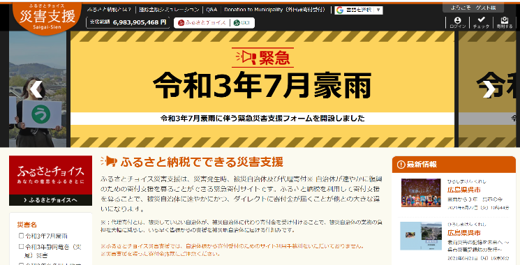 トラストバンクは、 7月3日に、 「ふるさとチョイス災害支援」において、 令和3年7月豪雨による被災自治体支援のための「災害時緊急寄付申込みフォーム」を開設しました。 7月10日9時半現在、 静岡、 神奈川、 鳥取、 島根、 広島県内の被災地計13自治体が寄付を受け付け、 累計1億800万円超(7,300件以上)の寄付を募っています。 寄付金は、 被災地の復旧・復興に使われます。