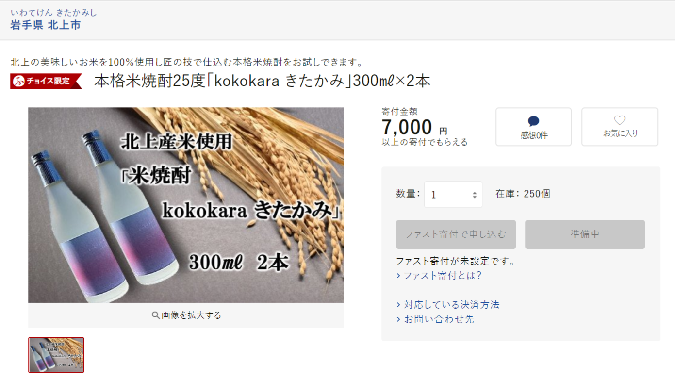 今回開発した米焼酎「kokokara きたかみ」はふるさとチョイス限定で300㎖×2本、 720㎖、 1.8リットルの3パターンで受付を開始します。