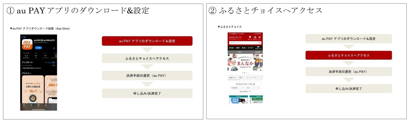 ふるさとチョイスでは、2019年10月よりauかんたん決済での決済に対応していましたが、本日より新たにau PAYでも決済ができるようになります。au PAYは、auに限らずスマートフォン・タブレットをお持ちのすべて方が「au PAY アプリ」から簡単な操作ですぐに利用可能となるため、au PAYユーザーは、登録しているユーザー情報を用いてふるさとチョイスでの決済が可能になります。2021年11月現在、ふるさとチョイスでは、クレジットカード決済に加え、Amazon Pay、銀行振込、郵便振替、現金書留、d払い、auかんたん決済、ソフトバンクまとめて支払い、コンビニ払いなどが利用可能です。