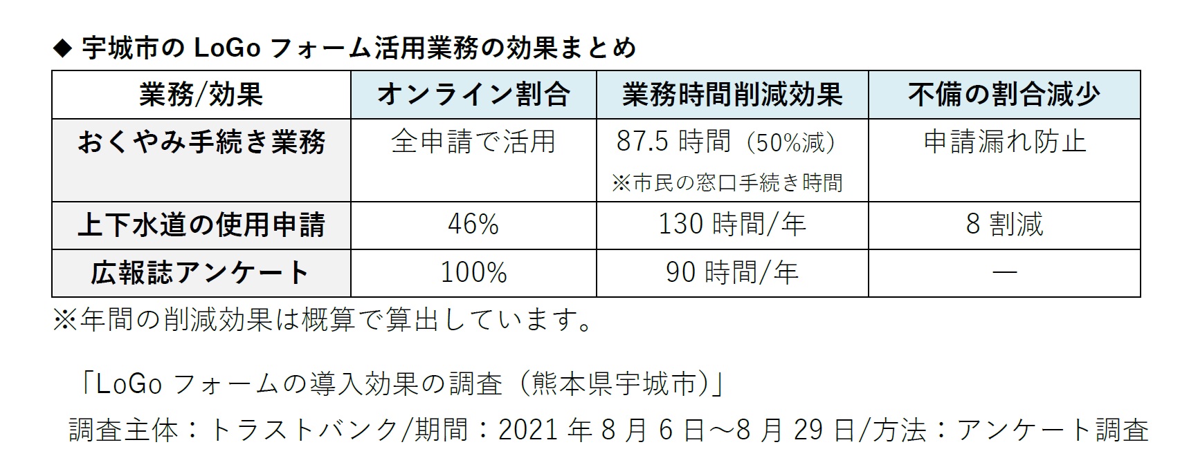 ふるさと納税総合サイト『ふるさとチョイス』を運営する株式会社トラストバンク(本社:東京都渋谷区、代表取締役:川村憲一、以下「トラストバンク」)は12月20日、行政手続きデジタル化ツール「LoGoフォーム」について、熊本県宇城市の行政手続きにおける導入効果を発表しました。