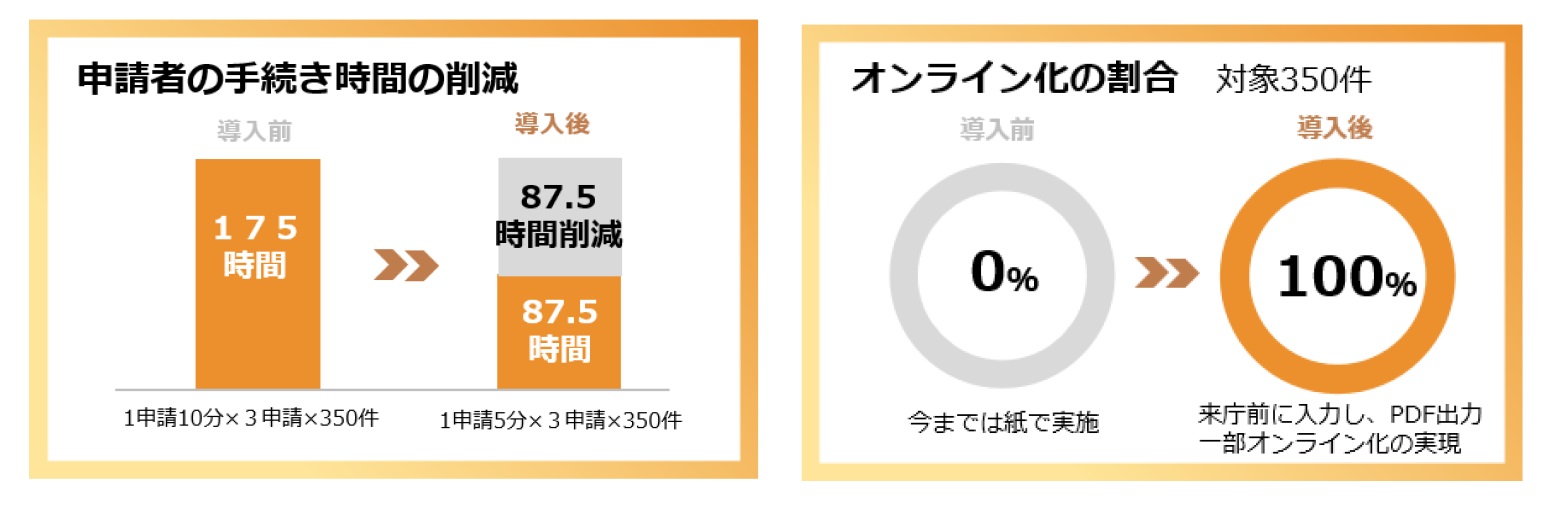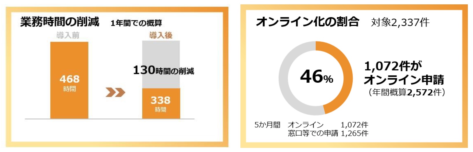 ・オンライン申請により、申請の業務時間が概算130時間減。窓口の受け付けも年間214時間の削減を試算。