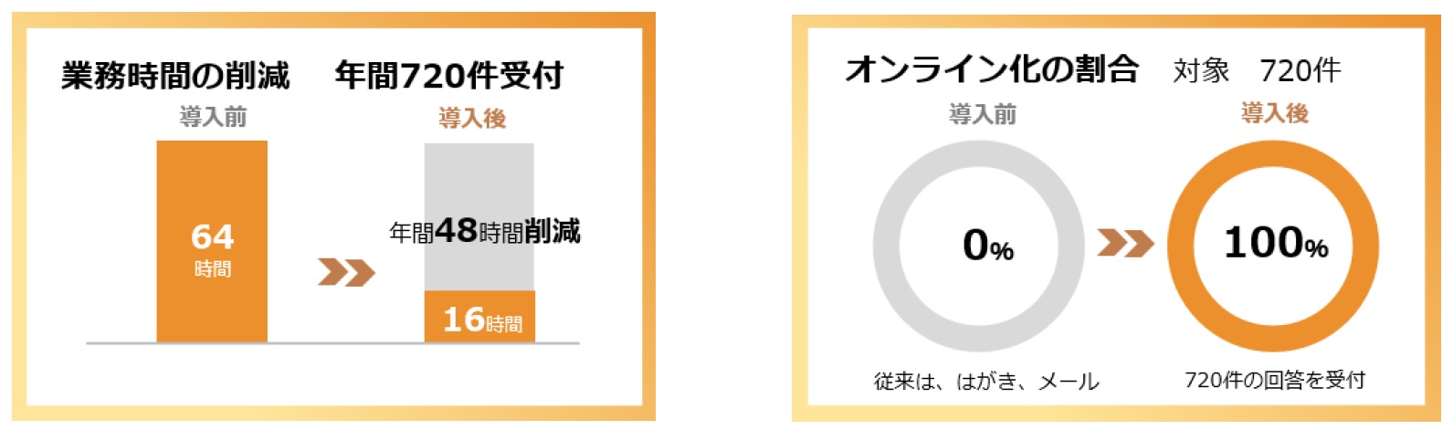 ハガキやメール受け付けの場合、1件あたり約4分の事務処理が発生していたが、オンライン化によりデータ化の作業が不要になったため、4分削減。年間720件の申請に対し、48時間の削減効果が見込まれました。