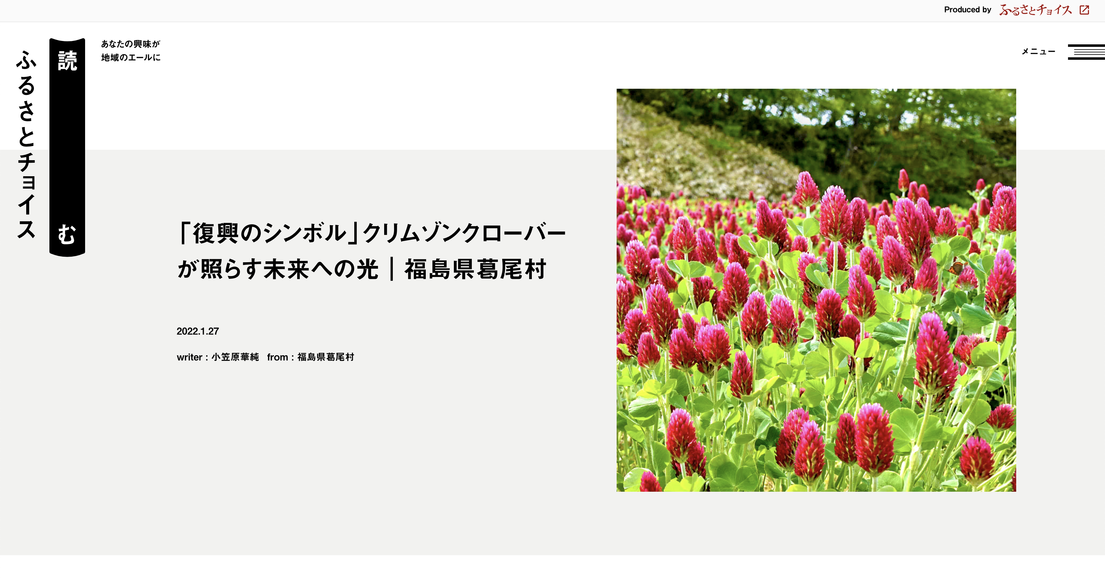 東日本大震災での原発事故によって全村避難を余儀なくされた葛尾村。この記事では、クリムゾンクローバーの美しさと共に、村の復興ストーリーを多くの方に知って頂きたいとの願いを込めました。