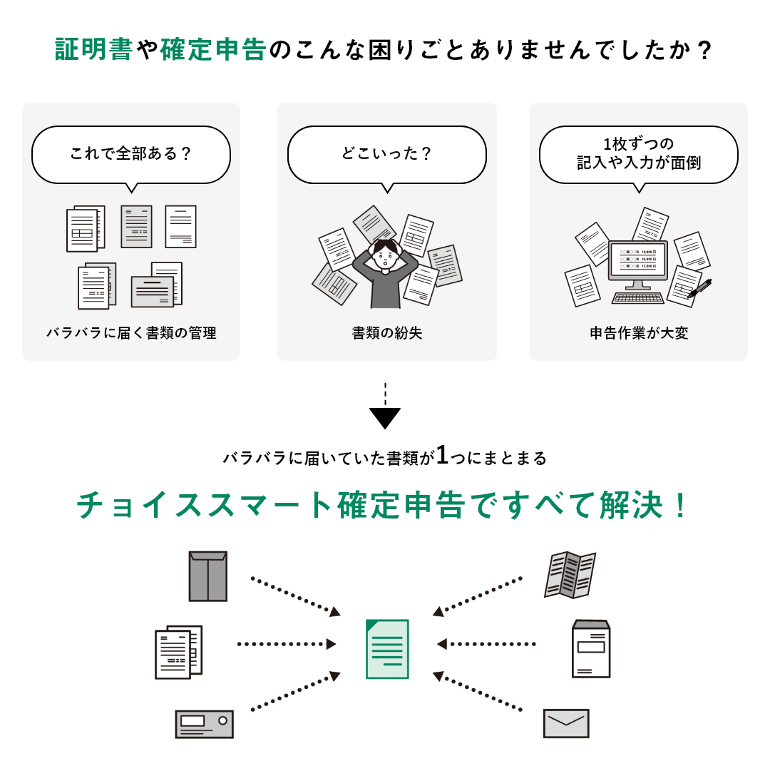 今回提供する「チョイススマート確定申告」によって、ふるさとチョイスにてダウンロードができる「寄附金控除に関する証明書」というファイルがあれば、2022年の確定申告より当サイトから行った寄付の証明として、この1ファイルのみで申告手続きができるようになります(※2)。また「チョイススマート確定申告」が各自治体から届いていた寄附金受領証明書の代わりとなり、受領証明書の保管や確定申告時にこれらの受領証明書を1枚ずつ貼り付ける作業、何度もデータを入力する手間が省け、確定申告の手続きが簡素化されます。さらに「チョイススマート確定申告」は、自治体や税務署職員の事務作業の負担を大幅に軽くし「よりよい街とくらしづくり」のための時間を創出します。