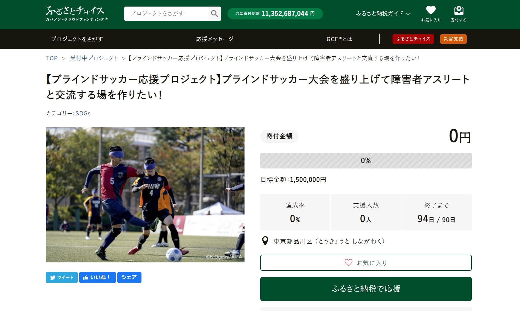 東京都品川区とふるさと納税総合サイト「ふるさとチョイス」( https://www.furusato-tax.jp/ )を企画・運営する、株式会社トラストバンク(本社:東京都渋谷区、代表取締役:川村憲一、以下「トラストバンク」)は、本日4月11日トラストバンクが提供する、ふるさと納税制度を通じてクラウドファンディング型で寄付を募る仕組み「ガバメントクラウドファンディング®」(以下GCF®)で、ブラインドサッカーの活動支援と啓発活動を目的としたプロジェクトを開始します。募集期間は2022年4月11日~7月9日で、目標寄付金額は150万円です。