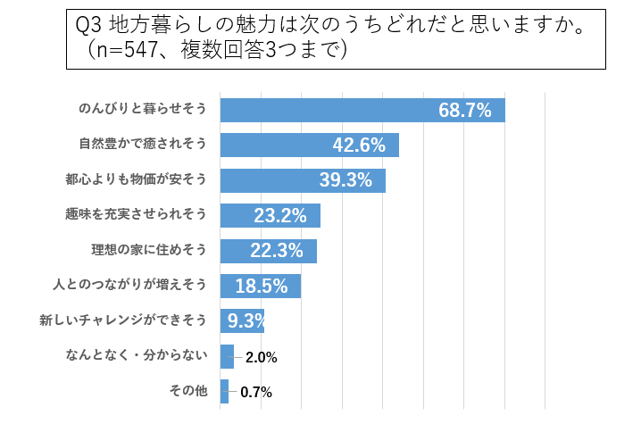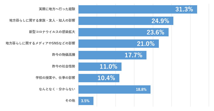 東京圏に住む若者の54.2%が「地方暮らしをしてみたいですか?」の問いに「はい」と回答。きっかけは「実際に地方へ行った経験」(31.3%)、「地方暮らしに関する家族・友人・知人の影響」(24.9%)、「新型コロナウイルスの感染拡大」(23.6%)が上位となりました。地域の魅力については「のんびりと暮らせそう」(68.7%)「自然豊かで癒されそう」(42.6%)の順に回答を集めました。