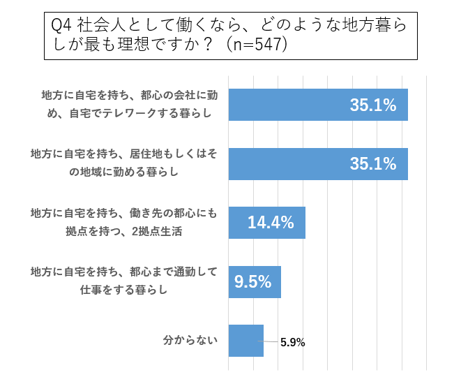 社会人として働く場合、地方暮らしの理想のスタイルを尋ねると「地方に自宅を持ち、都心の会社に勤め、自宅でテレワークする暮らし」(35.1%)、「地方に自宅を持ち、居住地もしくはその地域に勤める暮らし」(35.1%)が同率の回答を集めました。一方、地方と都心の両方に自宅を構える「2拠点暮らし」への支持は14.4%と、若者の間ではそれほど浸透していないことが分かりました。また自宅から都心まで通勤する暮らしを希望するのは9.5%にとどまりました。