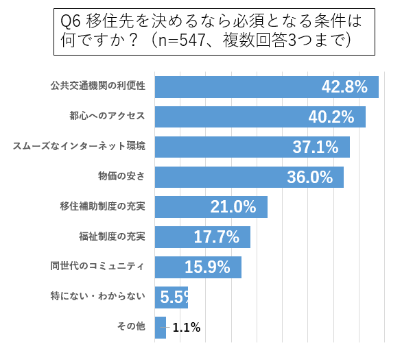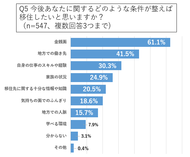 また、自分自身に関してどのような条件がそろえば移住したいかを尋ねた質問では「金銭面」が61.1%。次いで「地方での働き先」(41.5%)となったことから、転居や新生活に伴う費用が地方移住の際のネックになりそうであることが分かりました。