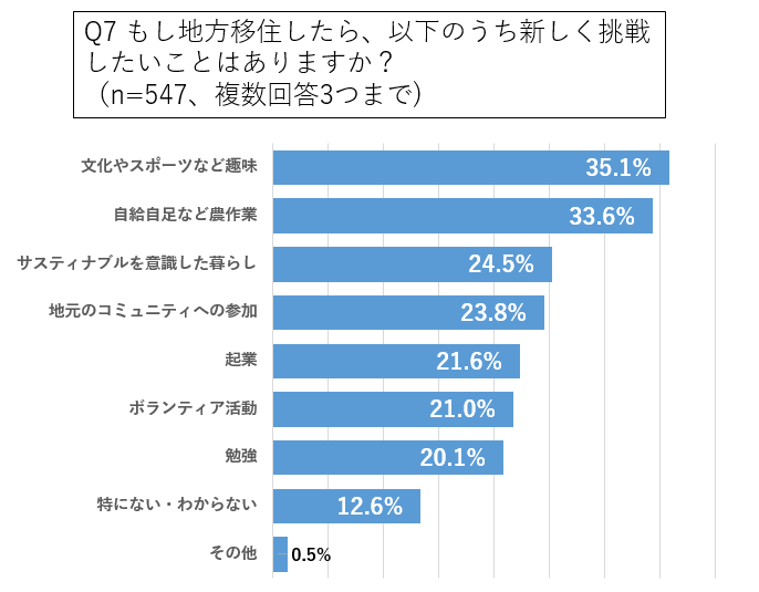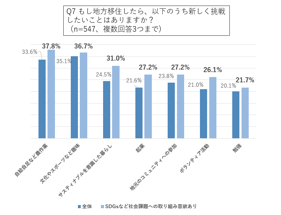 また、地方暮らししたら新たに始めたいことについては、SDGsや社会課題に取り組む意欲がある人のほうが「サスティナブルを意識した暮らし」(31.0%、全体比+6.5%)、「起業」(27.2%、全体比+5.6%)、「ボランティア活動」(26.1%、全体比+5.1%)などについて意向が高くなりました。