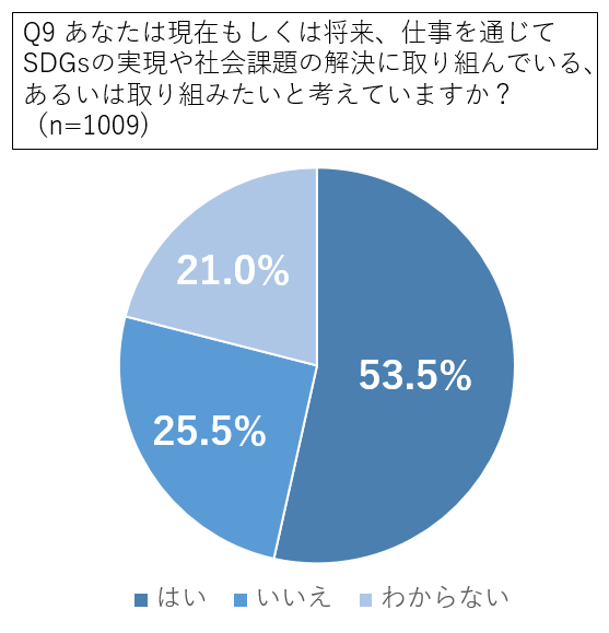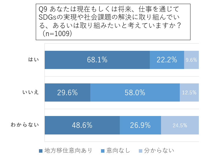 今回の調査対象となる若者全員に対し「現在や将来、仕事を通じてSDGsや社会課題の解決に取り組んでいる、あるいは取り組みたいと考えていますか」と質問すると、半数以上となる53.5%が「はい」と回答。さらに「はい」と回答した人のうち、地方暮らしに関心があるのは68.1%に上りました。一方、「いいえ」と回答した人は、地方暮らしへの関心も29.6%と比較的低くなる傾向にありました。