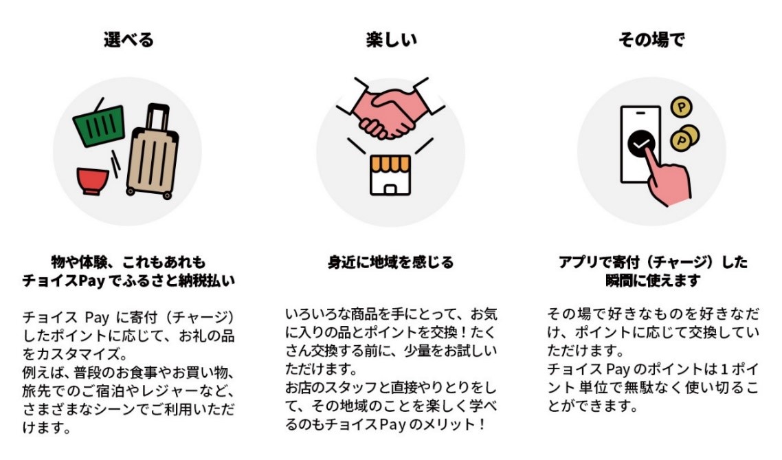「チョイスPay」で、ふるさと納税は「決済」として活用できるようになり、旅先はもちろん、これまで以上に身近での利用が可能となり、日常使いにつながります。自治体にとっては、新たな寄付の機会を広げるだけでなく、ペーパーレスによる環境への配慮や電子化による転売防止、人口減少に悩む自治体の手間とコストの削減の両立が可能になります。寄付者にとっては、タイムリーにお礼の品と交換や、小口利用も出来るようになり、より利便性が高まります。さらに地域の方や生産者との交流のきっかけともなり、地域理解にもつながります。