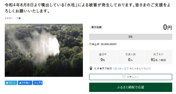 「ちょうど噴出から1ヶ月が経ちましたが、以前として勢いは収まらず、原因究明やごう音対策、塩害対策など、付近住民のストレス緩和、健康維持のため最善を尽くしておりますので、長万部町が一日も早く日常を取り戻せるよう、皆さまからの温かいご支援をよろしくお願いいたします。」