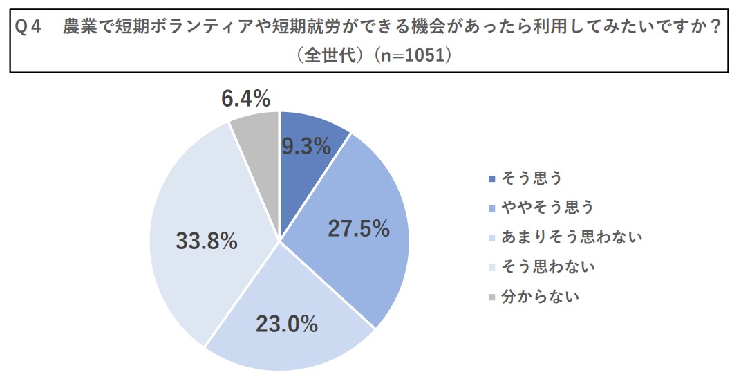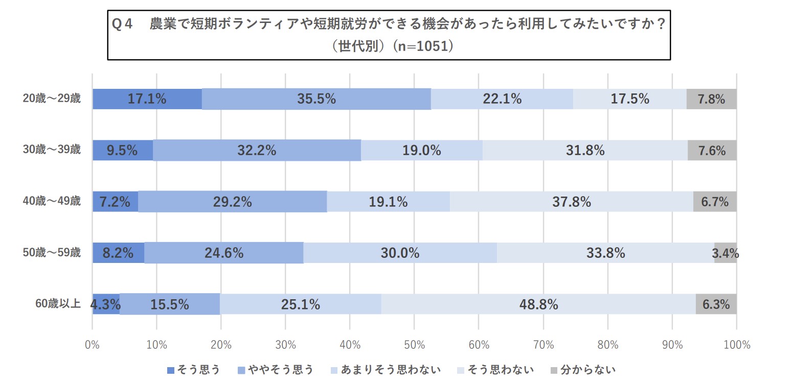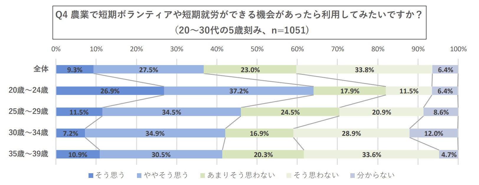 ■農業で短期のボランティアや就労ができる機会があれば利用したい人(「そう思う」「ややそう思う」の計)は 36.8%。年代差が大きく、20~24 歳に絞ると 65.3%が実施意向ありと答えた。