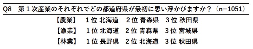 ■第 1 次産業で思い浮かぶ都道府県は農業・漁業ともに 1 位は北海道。林業の 1 位は長野県。