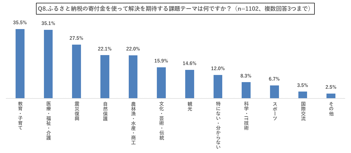 今回の調査では、寄付金を使って最も解決してほしいと感じている課題は「教育・子育て」であることが明らかになったほか、ふるさと納税経験者の約8割は日本の地域課題に関心があることが分かりました。また、20代の半数以上が、自治体の取り組み支援や災害支援などお礼の品を受け取らない形のふるさと納税の利用経験があることが分かりました。