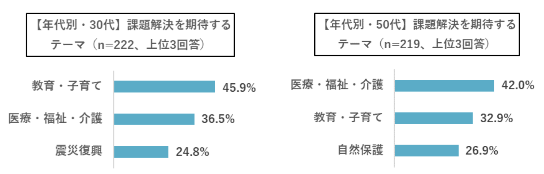 ◆ 寄付金による解決を期待する課題テーマでは「教育・子育て」(35.5%)が最も回答を集めた。年代別で見ると、30代では45.9%が「教育・子育て」の解決を期待するとした一方、50代の最多は「医療・福祉・介護」(42.0%)。身近なテーマへの課題意識が反映されたとみられる。