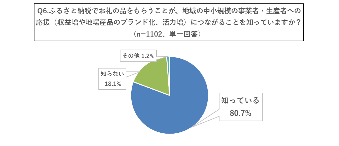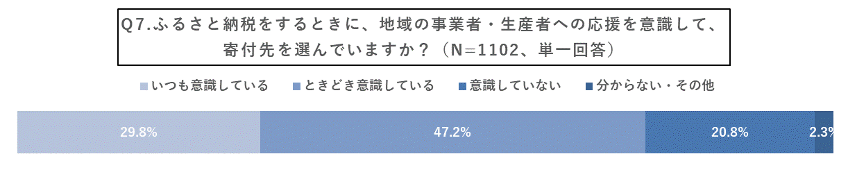 ◆ ふるさと納税経験者のうち、約7割が日本の地域課題に関心があると回答。また、約8割はお礼の品をもらうことが地域の中小事業者・生産者の応援につながっていることを知っていると答えた。寄付先を選ぶ際に中小事業者・生産者への応援を意識しているのは77%。