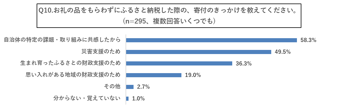 ◆ 課題解決型のクラウドファンディングや災害支援など、お礼の品を選ばずに寄付金だけを送る形のふるさと納税については26.8%が利用経験ありと回答。年代差が大きく、20代は半数以上が「ある」と回答したのに対し、50代では8.7%にとどまり、若い世代を中心に広まっていることが判明。きっかけを尋ねると、多い順に「自治体の特定の課題・取り組みに共感した」「災害支援のため」「生まれ育ったふるさとの財政支援のため」などが回答を集めた。