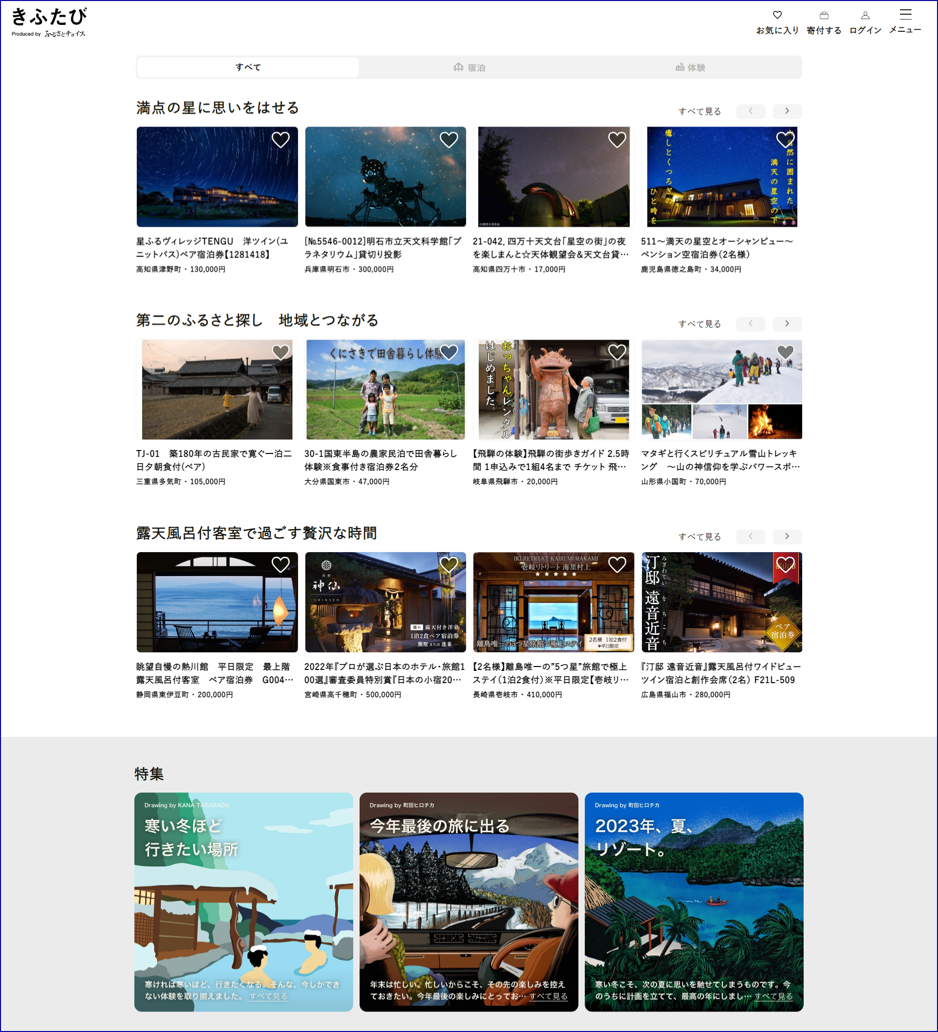 新しい「きふたび」では、旅に関連するさまざまな特集を用意し、求めている旅のテーマに応じたお礼の品を簡単に見つけることが可能になります。「ふるさと納税ならでは」と言える、地域の特色を生かしたお礼の品もピックアップし、旅行サイトとの検索とは異なる「新たな地域の魅力を知る機会」も提供します。