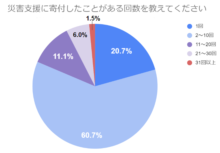 ◆ 寄付経験者の約8割が過去に2回以上寄付しており、災害支援寄付を一度経験すると、別の災害が起きた際にも再度寄付しやすい傾向にあることが分かる。