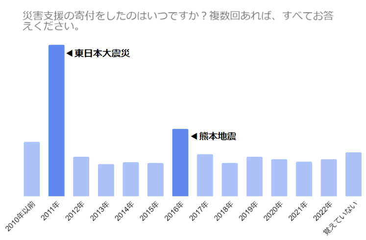 本調査では、回答者の約半数が災害支援への寄付経験があるほか、寄付経験者の約8割が2回以上の寄付経験があることが分かりました。寄付した年で最も多いのは東日本大震災の起きた2011年で、熊本地震の起きた2016年が続きました。また、自身にゆかりのない地域で起きた災害であっても支援寄付をする人が約4割いることが分かりました。