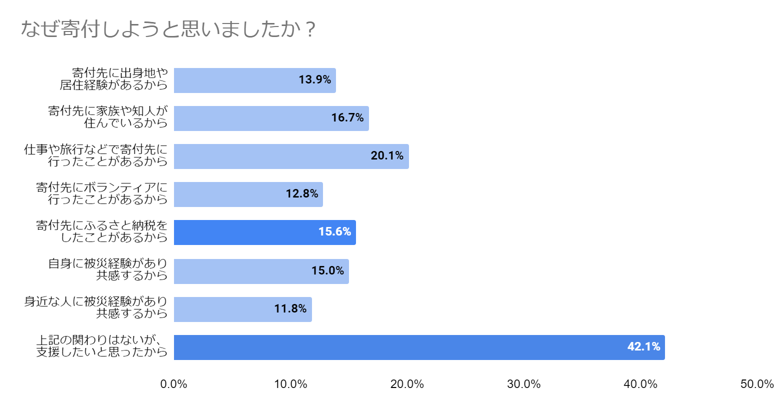 ◆ 自身にゆかりのない地域で起きた災害であっても支援寄付をする人が寄付経験者の約4割。また、過去のふるさと納税経験がきっかけで支援寄付した人は約15%。ふるさと納税が特定の地域に愛着や関心を持つきっかけになっており、その地域が被災した際には災害支援寄付をする人が一定数いることが分かる。