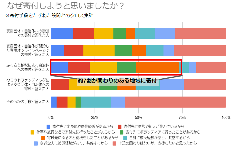 ◆ 寄付手段ごとに寄付の理由を見てみると、ふるさと納税による災害支援寄付者のうち、関わりのある地域に寄付する人が約7割。ふるさと納税で災害支援寄付する人は、寄付先地域とのつながりを継続していると言える。