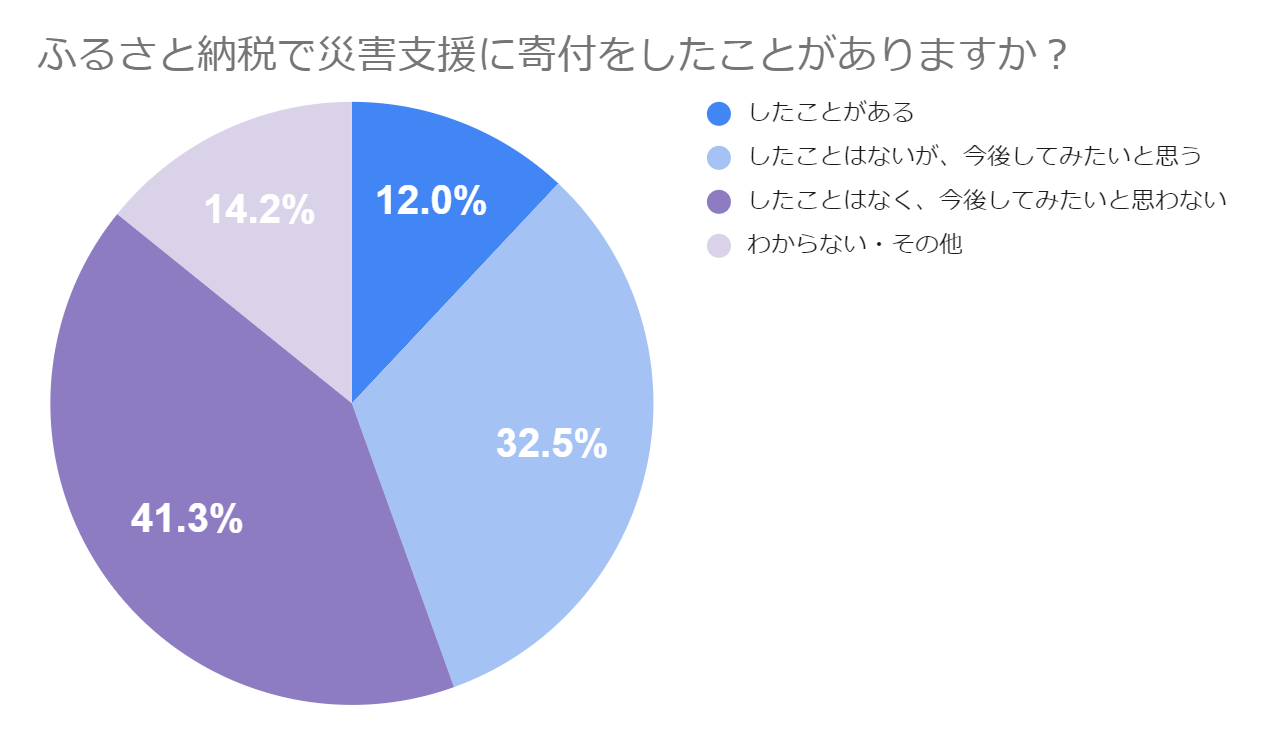 ◆ ふるさと納税での災害支援経験者は12%、今後してみたいと思う割合は32.5%。手段にふるさと納税を選んだ理由で最も多かったのは「現地にいかなくても支援できるから」(32.3%)、次いで「支援したい自治体を選べるから」(25.8%)。