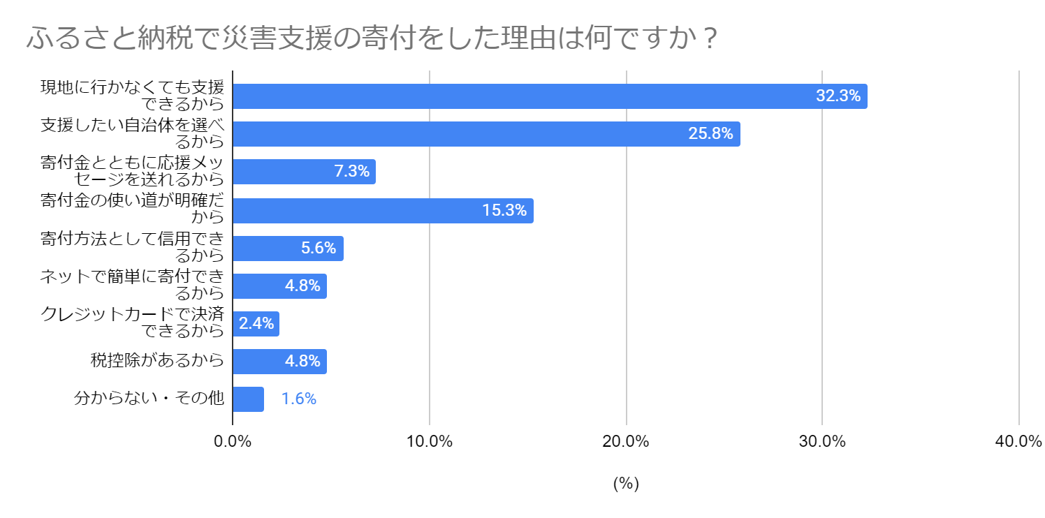 7) ふるさと納税での災害支援の寄付理由で最も多かったのは「現地にいかなくても支援できるから」(32.3%)、次いで「支援したい自治体を選べるから」(25.8%)